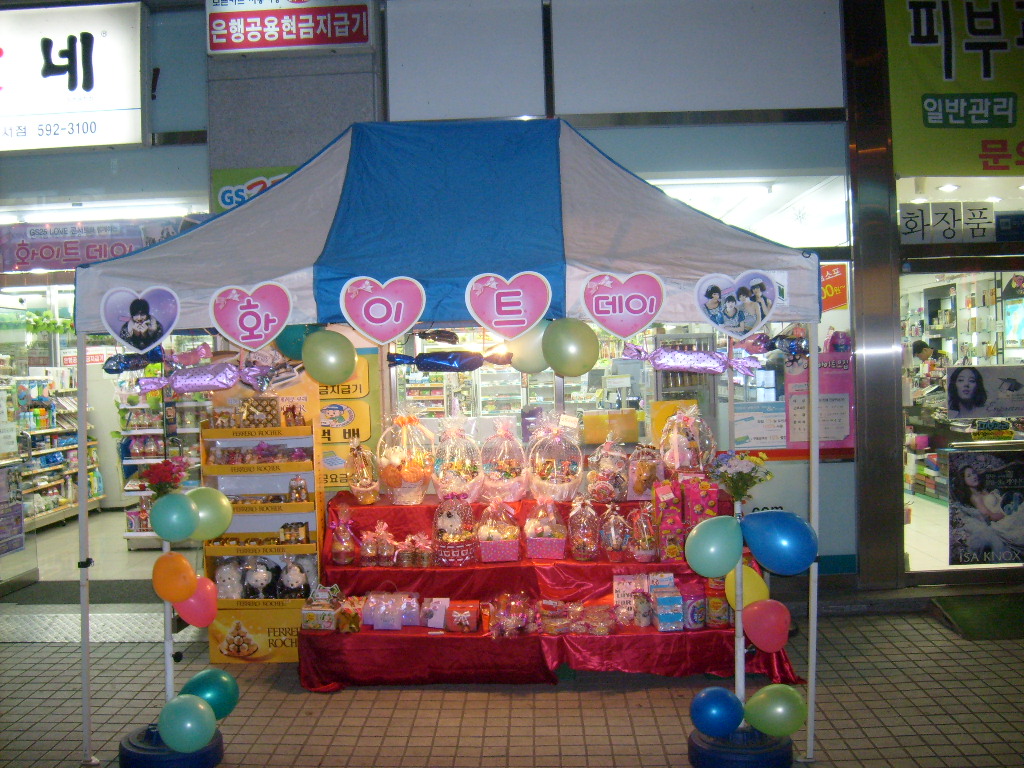 March 14th, White Day, is when men who were given Valentines gifts on February 14th (Red Day), reciprocate, usually with gifts of chocolate, white lingerie or other presents. Like many of the silly days we celebrate around the world, Mother’s Day, and Father’s Day, for example, White Day is a fairly recent invention, not as usual an innovation by a card company, but by a confectioners based in Fukouka, Japan which launched the first White Day in 1978. For saddo men, myself included, April 14th, Black Day, is the day to ‘celebrate’ being sad and single. Considering the animosity many Koreans express for Japanese history, if not Japanese people, I am surprised White Day has become so popular. Although it might not manifest itself in a significant way, even the small store near my apartment has appropriate gifts and I have seen several market stalls this week selling various chocolate items. So, like Valentines Day, for me at least, White Day passed by almost unnoticed.