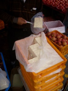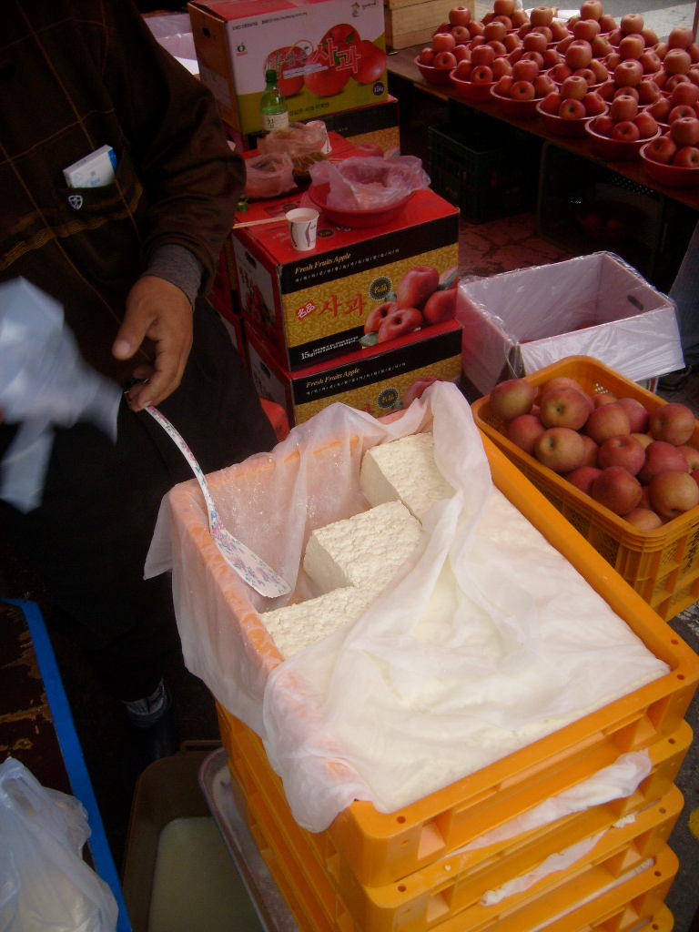 Every Monday morning, I buy my tofu at the street market in Song-So. The block, which is about a third smaller than a house brick, costs 1000 Won (5o pence sterling), and it will last me a week used predominantly in soups. It is aslo very nice fried with sesame oil, sprinkled with sesame seeds and accompanied with a little soy sauce.