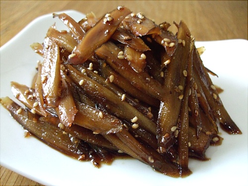 In Korea, burdock taproot is a fairly common sight both in street markets and supermarkets and a bundle of whole root (통우엉),will cost around 2000-3000 Won (£1-£1.50.) The roots are used to make various side dishes and as a vegetable in soups etc.