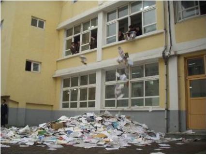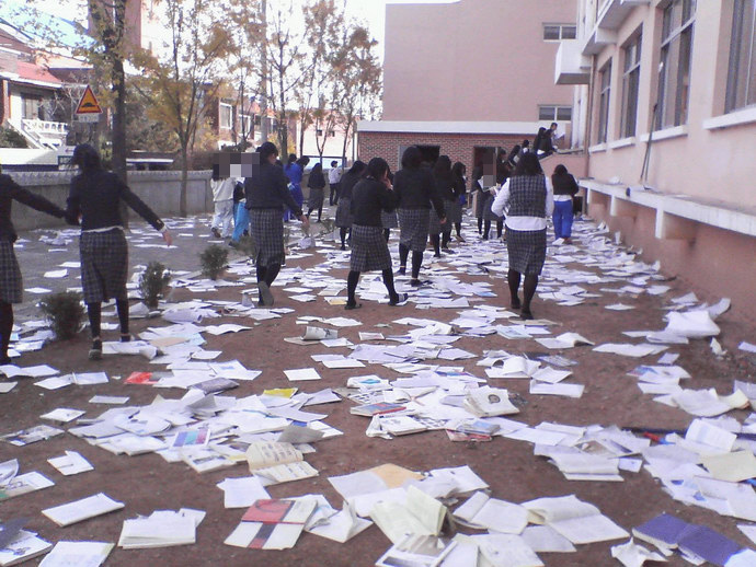And when the exams finish, all the text books and notebooks used by the students throughout the year are unceremoniously tossed from the go-sam windows, often on the 3rd floor. Of course, the pressure isn’t off as from 6pm onwards, newspapers can publish exam questions and the agonizing process of self assessment begins until the results are finally released. And of course, as with every exam in Korea, only those with perfect scores are allowed to feel any satisfaction and even this is down played.