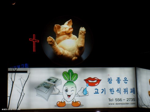The smelt van is a holocaust on wheels and it doesn’t do to ponder too long on how a fish might perceive the various processes practiced. Being tossed in batter and chucked in the fryer is a fairly horrible way to go. However, the smell of fried fish quickly rescues one from contemplation and their tasty crunch has the capacity to banish both empathy and sympathy. You have to eat tempura at the cooking source because  by the time you get home the batter is cold and soggy but eating those delicious little morsels under the van’s canopy reminds me of how little respect we have for fish. Imagine a van with a small chicken pen perched on its tail, the chickens contentedly pecking away at  grains of corn strewn over the pen’s grass floor. And then, a hand grabs a chicken, chops off its head and expertly plucks the feathers and while still in the throes of death, drags it through some batter before committing it to the fryer. No tantalizing aromas could banish my horror nor  the tastiest, succulent flesh extinguish guilt. With warm blooded animals, even a stupid chicken,  the point and location of death and the culinary process have to be  clearly separated.  Many of us are so mortified by warm blooded death that we can’t even buy the flesh in the same location in which  it was killed and in the English language have to partition the meat for the animal;  personally, ‘pork’ is infinitely more palatable than ‘pig’ and a lot less likely to incur pangs of guilt. At least Koreans appear less troubled by canivourism when they are able to suck on a pork bone in a restaurant in which the walls or menu are adorned with  photos, paintings or  other images of piggies, in some cases bizarrely anthropomorhphised.