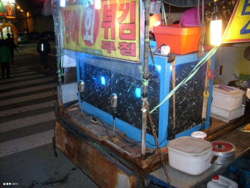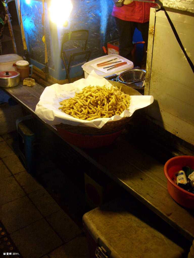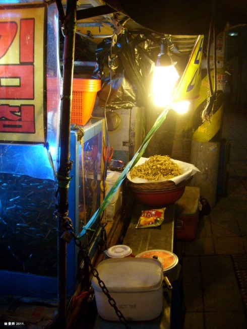 Koreans call them bing-oh (빙어) and they one of the less common streets foods whose western name, smelts, has a rather ironic foreboding.  Smelts are the name for a family (Osmeridae) of  fish (probably the hypomesus japonicus) which inhabit the water between Korea and Japan and which swim in large shoals. Various species of smelt exist both in the major seas, oceans and in freshwater but the Korean specie is one of the smallest, only a few centimeters long.  Stood watching them is mesmerizing and it’s easy to see the therapeutic  use  aquariums have as a means of inducing relaxation and lowering blood pressure; a couple of seats in front of the tank would surely attract customers.