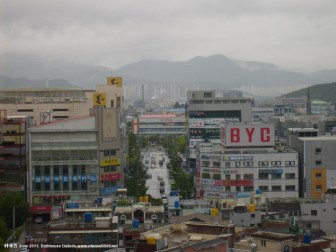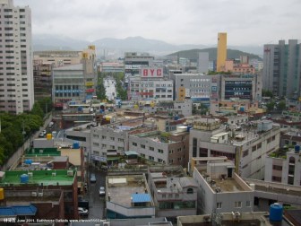 Daegu got the back-end of Typhoon Meari, typical in the monsoon season (Chang-ma 장마), which caused havoc and took nine lives in Jeju and Pusan. Saturday morning saw torrential rain and gusts of wind which didn’t abate until Sunday evening. The photos and video, taken from the 14th floor of my friend’s apartment, provide a great view across the Song-so area of Daegu, towards the distant mountains. As for the typhoon, luckily,  by the time it was inland, it was really only a big storm. All photos link to Wikimapia.