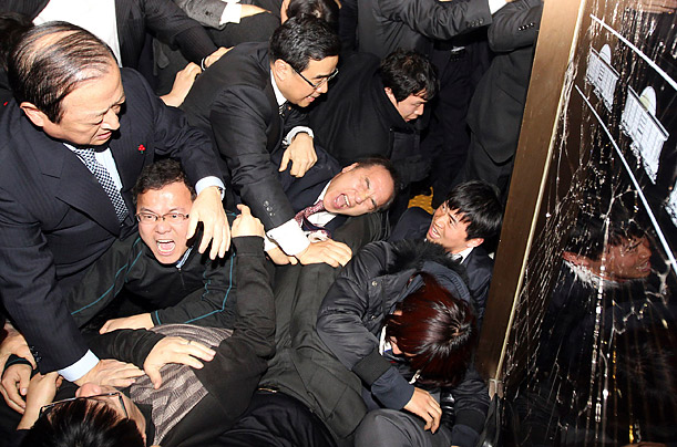 I’ve never met a butch Korean male and neither have I met a Korean man who in any way made me feel threatened or intimidated. Does Korea even have any macho, aggressive type men, the type who will shove a glass in your face if you so much as look at their girlfriend or knock into them in a bar? And when I have seen them fighting it has been quite hilarious. I saw a fight a few months ago and stopped to watch. There were three men, all in their fifties, all drunk and shouting while intermittently smacking each other with their umbrellas. The fight was wonderfully cute, like it was being performed by ducks or rabbits or some other animals incapable of actually causing real damage. And despite their anger they wielded their umbrellas in a manner that might be described as totally pussy. An umbrella can be a particularly nasty weapon especially if the spike is jammed into your eyeball or mouth, or the hooked handle swung upwards into your testicles or used to cause damage to the windpipe. I can think of an entire arsenal of umbrella techniques all the result of earning a taekwon-do black belt in Europe, which took a minimum of four years study with the ITF (International Taekwon-do Federation) as opposed to the taekwondo taught in Korea (WTF), where black-belts and dan grades are handed out like candy, often in less than a year.