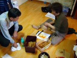Recently however, I’ve taken my tantrums out on kimchi that hasn’t wilted properly when doused with salt. A few weeks ago a cabbage that refused to wilt was given a stern talking to before being savagely torn to shreds. This weekend I got so annoyed with a badly behaved Napa that I ripped it apart and then cursing, dumped half a sack of salt on the remains. I realised, as about 4 kilograms of salt was burying the cabbage, that this was overkill and such a quantity was likely create a meltdown rather than encourage some wilting but in the heat of the monent all rationality evaporates. Later in the day, I met some friends who taking pity on my endeavours, came to my one room armed with two large cabbages and a new bag of salt.