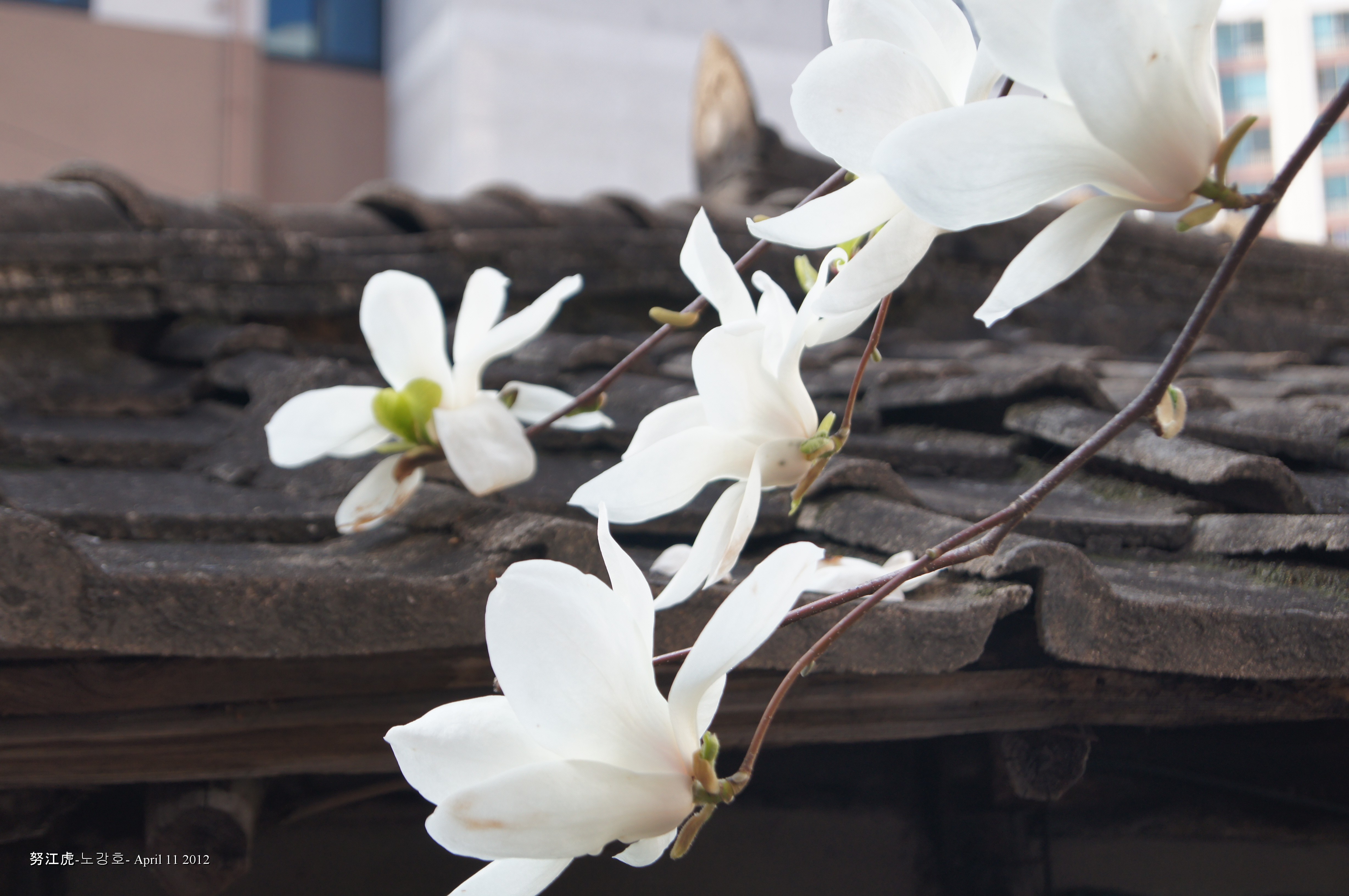 One of the first indicators that spring has arrived. I actually took these photos on April 11th but a bad flu delayed my posting them. The magnolia (목련) is one of my favourites and these examples were nestled against a traditional Korean house.
