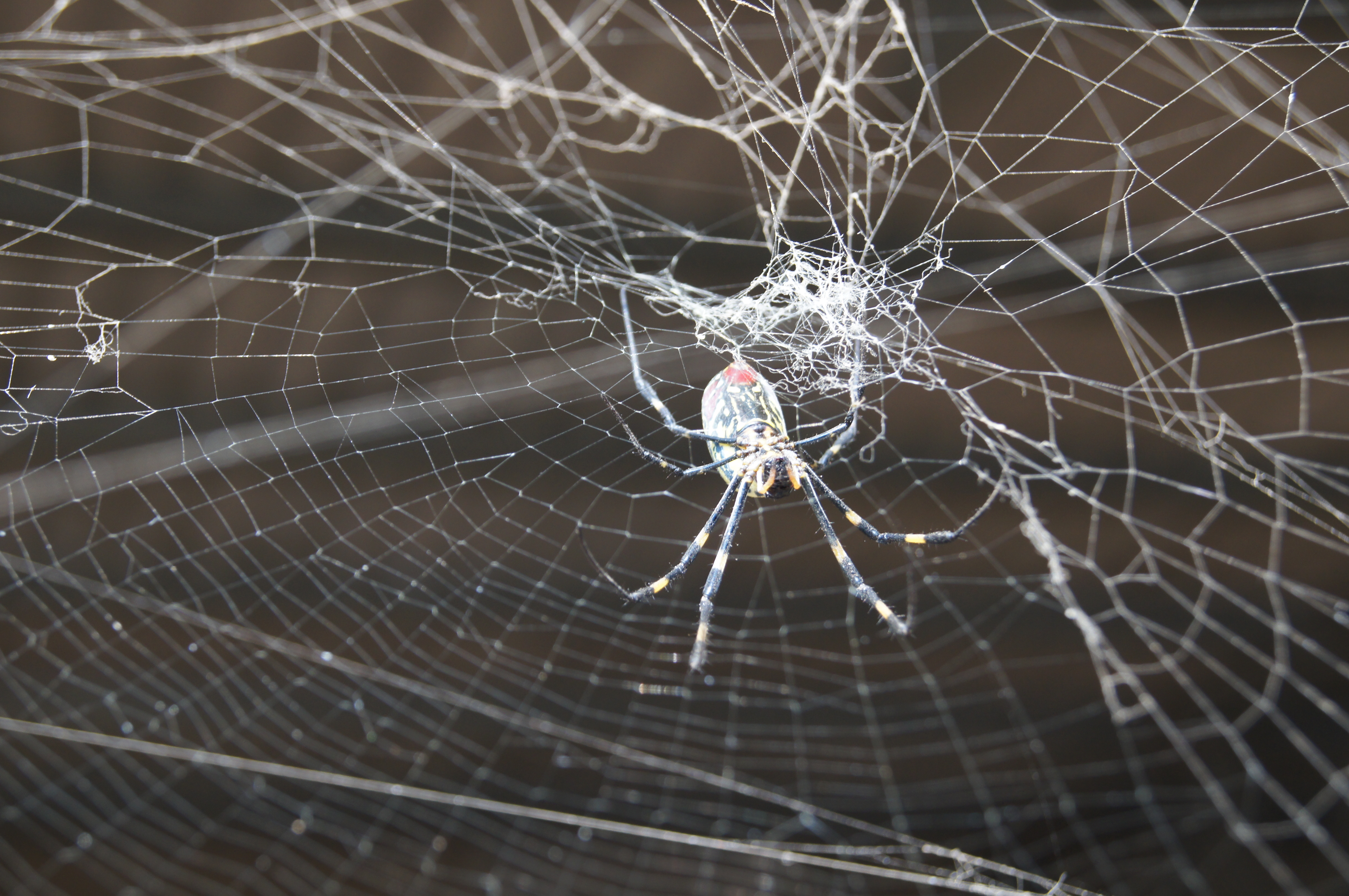 The numerous spiders on these webs were neither as large nor colourful, possibly as it is right at the end of their mating season and the end of autumn. Their webs however, were not just large, 3 meters across, but densely intertwined. The genes of the mu-dang have been used in genetically cloning silk worms in order to produce stronger silk. Only the female carries the red marking and apart from being larger than the male, she has cannibalistic tendencies after mating.