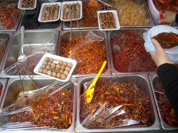 Basically, ban ch’an (반찬) is the collective term for the extensive number of side dishes which can accompany a Korean meal. This most noted of these being kimchi (김치) but of course, there are many different types of kimchi. I used to buy my ban ch’an in E-Marte but have discovered it is much cheaper to buy in street markets, or even cheaper if you make it yourself.