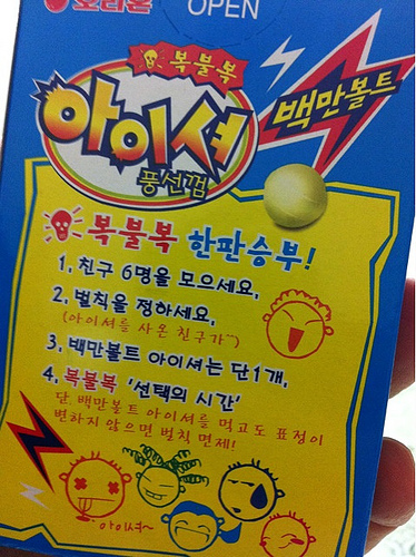 Specially for Children’s Day! In every box of Ai-sh-yo, is an intensely sour gum. You can’t distinguish the gross one from the others in the box. If you want to punish your students or get some pleasure after they’ve pestered you all week for Children’s Day candy, you can do so in this random manner.