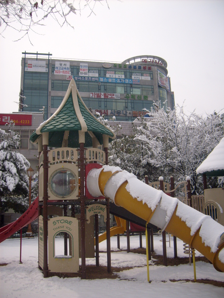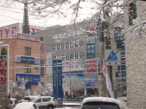 Just when you thought it was safe to ditch the duck down thermal anorak, and winter suddenly reappears. After several afternoons with spring in the air, Sunday morning saw Apsan Mountain, Daegu, dusted in snow. So, after an invigorating bowl of chicken and ginseng soup, we took the cable car to one of Apsan’s summits. It was freezing with icy patches underfoot and a wind that stung the ears. Icicles hung from the summit buildings and surrounding trees were covered in a powdery snow.