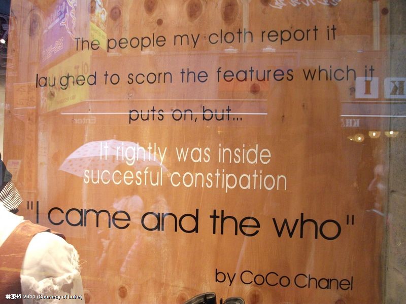 One of my friends discovered this wonderful example of bad English in downtown Daegu, a few weekends ago. This isn’t just a little gaff, it’s total nonsense. And who cares what Coco Chanel had to say, she was a super rich bitch Nazi collaborator whose past continues to be rewritten. Her talents, like that of many celebrities past and present, would quickly have been exposed by a vigorous facial with a cheese-grater.