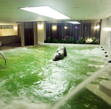 The warm pool with the pine, steam and ice room in the background. A large TV sits above the central circular window (Migwang Spolex)
