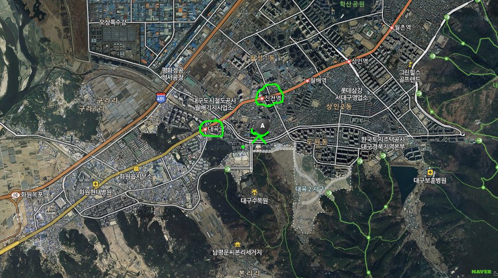 Daegook and Chin-ch'eon subways (circled L-R) with 'X' marking Saeng Hwal. The green dot to the right is nearby Na-Seong Hawaii Sauna