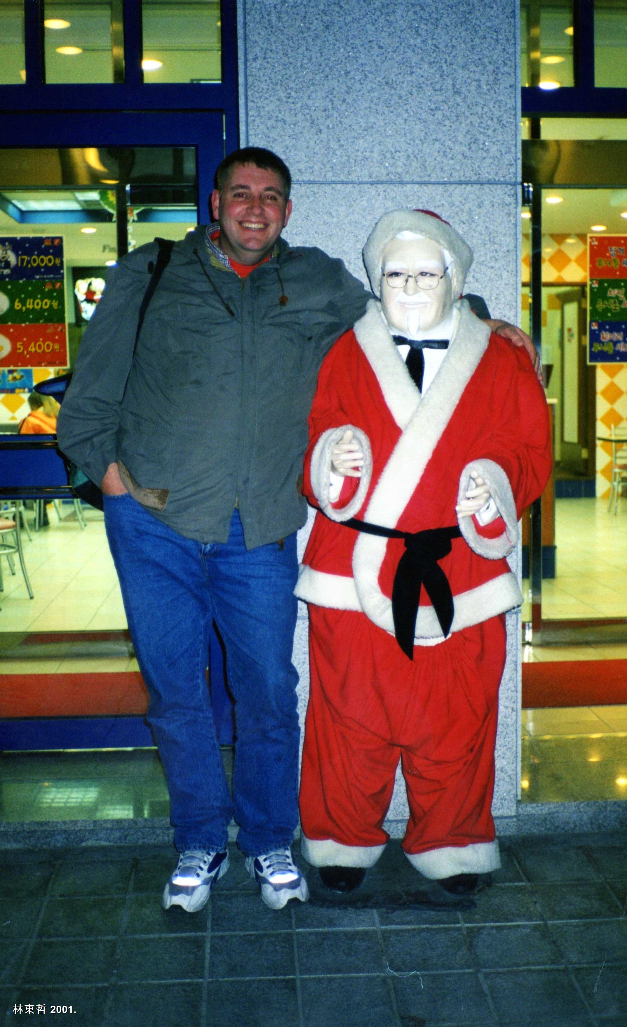 When we arrived back at Daegu central bus terminal, we took at taxi to Song-So and had a chicken burger in KFC. When I walk to my school, I usually come out my front door, turn right and then walked down to the crossroad where I take a left turn. This road leads down to Kemyoung University though this is probably a twenty-minute walk. There is a definite divide of apartment blocks and parks between Song So and Kemyoung. From the crossroad on this road to my school, is no more than a few minutes’ walk but in that time one passes MacDonald’s, KFC and a Korean burger chain called Lotteria. Apparently, Lotteria is more popular than is MacDonald’s. Since my first trip to Daegu there has since appeared a Baskin Robbins ice-cream parlour with a second one being built at the new plaza complex near the crossroads to my apartment. A Pizza Hut restaurant is the very last commercial enterprise as you leave Song So on the road towards Kemyoung. Back to the KFC restaurant where Pauline and I are sat on New Year’s Eve; outside the restaurant stood a life-size plastic statue of Colonel Sanders, the staff have dressed him in a Santa outfit and even given him a cane which hung from one of his wrists. The cane, which wasn’t fixed on the statue but just hooked over a wrist, remained there for my whole stay in Korea; no one thought to steal it, remove it or throw it away.