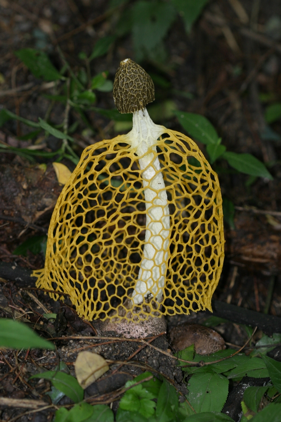 Although I’ve seen numerous varieties of stinkhorn, only ever in northern Germany, I have never seen any of the netted versions and do not think such types grow in the UK. When I caught a glimpse of vivid yellow in the undergrowth and discovered four pristine Netted (or Mantle) Stinkhorns (망태 버섯), I cursed myself for having no camera. Make no mistake about it! Stinkhorn mushrooms, even though edible, have a strong and rotting stench that will easily make you retch. Their purpose is to lure flies to that obscene helmet where they will trudge about picking up spores on their feet which they subsequently help disseminate.
