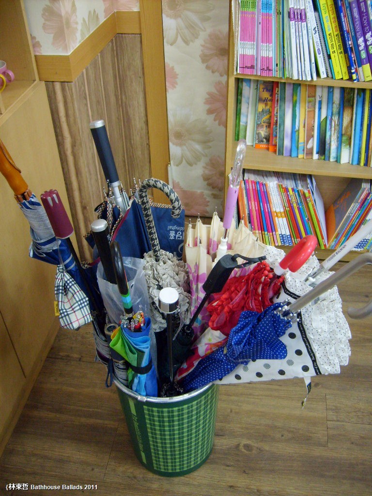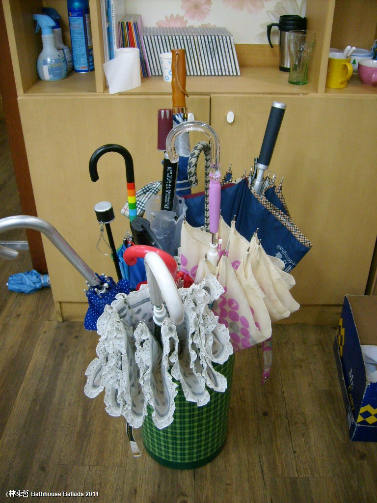 Two photos of the variety of umbrellas brought to school when it’s either raining or likely to rain.