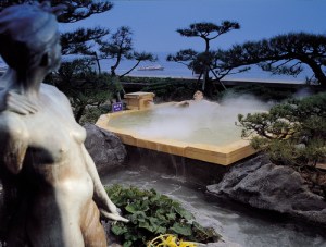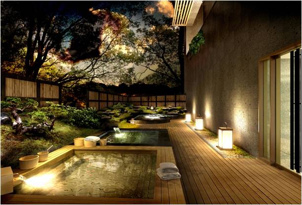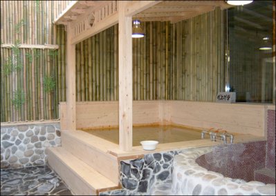 A hinoki tang in the full traditional Japanese style, with a roof and a constant flow of water into the pool by way of what looks like a wooden box, is a pleasing sight.