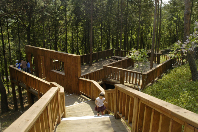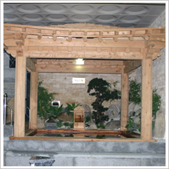 The far left of the entrance contains the entrance to an area exposed to the outside temperature and known as a no-cheon (노천). Of the indoor no-cheons I have visited, this was the most successful. The area comprises most of the width of the bathhouse area and contains a cold pool (냉탕) and a steaming, large ‘forage bath’ (목초탕). The area is pleasantly decorated, although the plants are plastic, with spouting water features and in one corner are even a pair of small male and female totem poles. In this area is also a Finnish style sauna. A couple of seats allow for relaxation and provide a view, upwards. to the edge of the mountain. Usually, for the sake of privacy, indoor no-cheon areas have slated type windows which are frosted and though they allow the breeze to enter, hence providing outside temperatures, they usually have no view. The mountain at this point is steep enough to be void of footpaths and public and though there is a large frosted panel blocking any horizontal view, one can look up and glimpse the mountain slope. The no-cheon area is pleasantly decorated, though the plants are plastic, with stone features, water spouts and there is even a pair of small, male and female totem poles (장승) guarding the area. The no-cheon area also has a Finnish-style sauna.