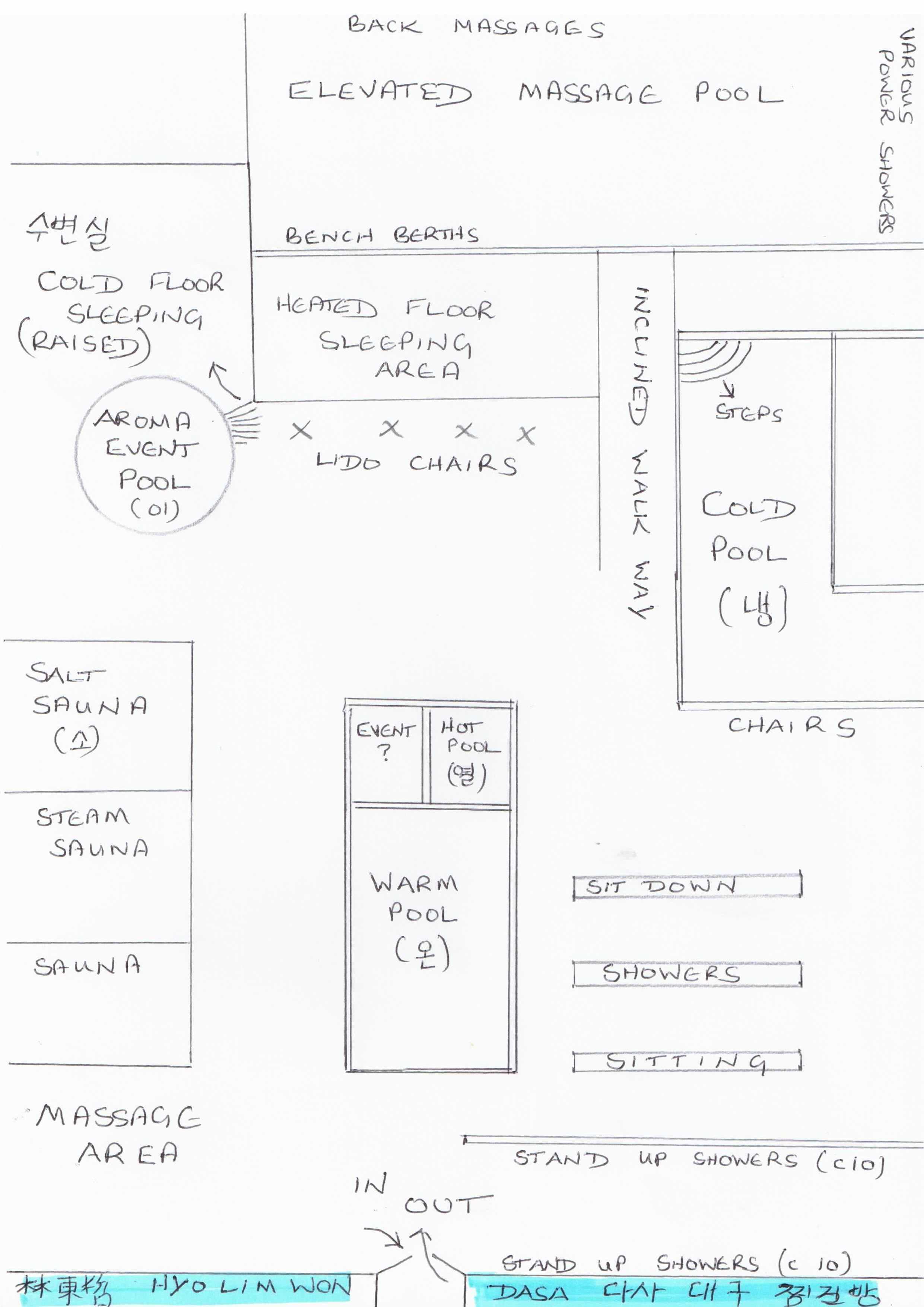 Facilities – (in process of being researched) 1st floor reception, women’s bathhouse, jjimjilbang, men’s bathhouse, coffee shop, shoe shine, barbers.