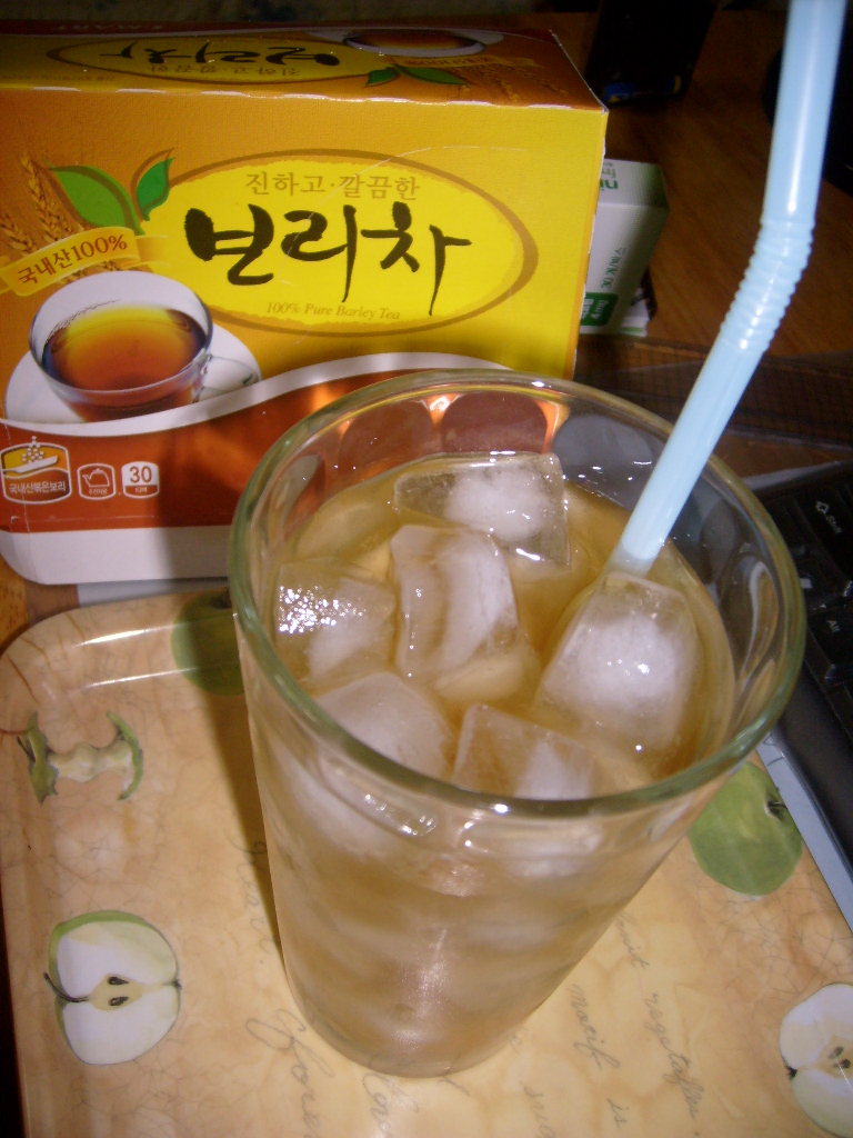 In summer, I prefer water or a chilled, non sweetened cereal drink or a tea as a refreshment. My favourite is probably mistletoe tea (겨우살이) but a close contender is bamboo leaf tea (데잎 차) The tea comes in bags which can be a little difficult to find though it can be bought in other forms. I couldn’t buy the bags in my local E-Mart or Home Plus but I know two small delicatessen type shops which sell them.