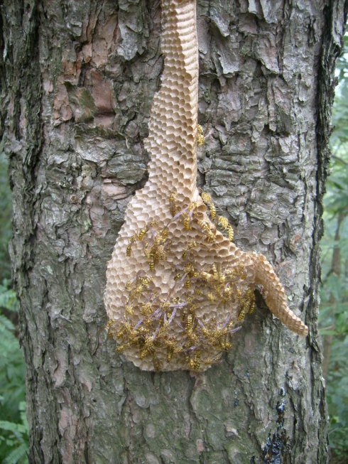 I noticed a wasp nest on a tree and watched it over several mornings. These wasps are much smaller than European ones.