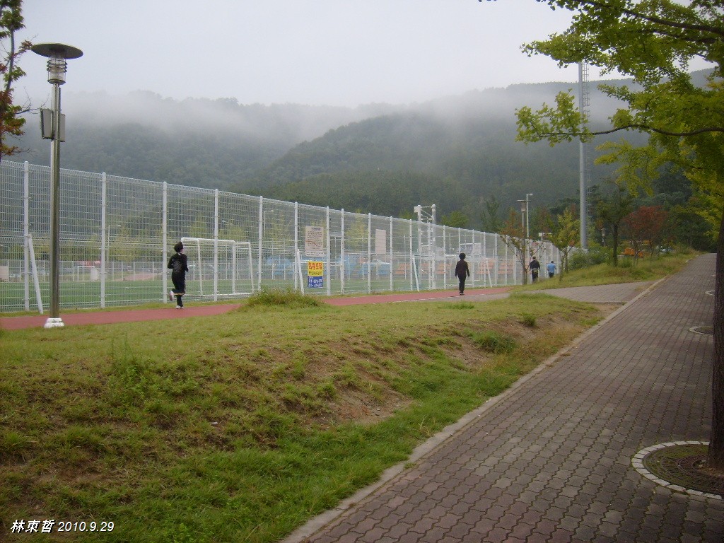 The point at which Warayong mountain trail begins is directly opposite the municipal sports center and swimming pool with adjacent football pitches and tennis courts. As dawn broke there was already a football match underway and around the pitches I counted twenty two people briskly walking. As is usual in Korea, they were mostly middle-aged and older.