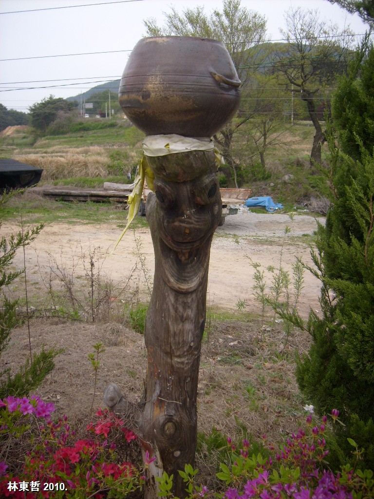 Stood in a row along the small road, warding away demons and evil, were a number of totems (jang-seung 장승) Totems guard the approaches to villages and scare away evil spirits and were, and in some cases still are worshiped (tutelary deities). Different parts of Korea have different totems and they are closely associated with shamanism.