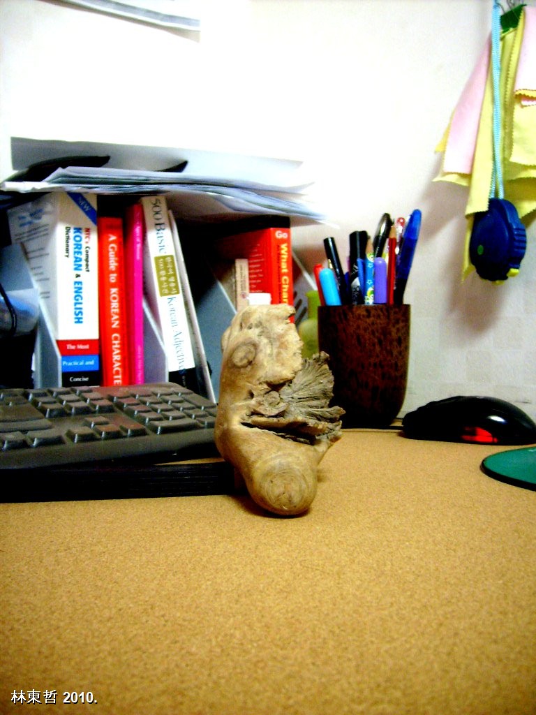 A few months ago, when I visited Palgongsan Park in Daegu, I bought a small carving which cost 10000 Won (£10), the nature of the wood is interesting; a section of branch or small stem which on one side, a burr (burl – US English) has caused to ‘explode’ in a fascinating manner. I’m indebted to a reader for identifying this feature and also drawing my attention to the fact it is highly weathered. The wood has been used to carve a totem-like face while the burl, now forming the back of the head, forces one to seek meaning in the combination. From another angle, a second, half face can be imagined.